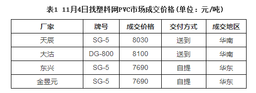 據(jù)找塑料網(wǎng)成交數(shù)據(jù)顯示(見表1)今日上午國內(nèi)PVC市場成交價(jià)格繼續(xù)拉高,期貨震蕩下行,但依舊阻擋不了PVC市場迫切上漲的行情。目前來看,場內(nèi)貨源不多,價(jià)格堅(jiān)挺,終端抵觸,整體出現(xiàn)有價(jià)無市局面,今日華東電石法SG-5主流價(jià)格維持在7700-7800元/噸(自提);華南市場電石法SG-5主流成交價(jià)7950-8000元/噸(自提)。找塑料國內(nèi)PVC實(shí)際成交指數(shù)為978點(diǎn),較上一交易日上調(diào)5點(diǎn)。