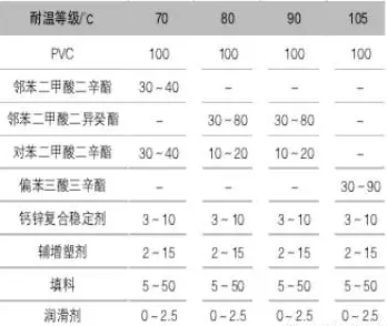 蘇朝北[3]~ [4]等經(jīng)過一系列研究,用國(guó)產(chǎn)鈣/鋅穩(wěn)定劑,配合適當(dāng)溫度等級(jí)的增塑劑,分別制得了70,90,105℃的環(huán)保PVC護(hù)套料,環(huán)保要求符合RoHS規(guī)定,性能可滿足GB/T 8815-2002的要求。