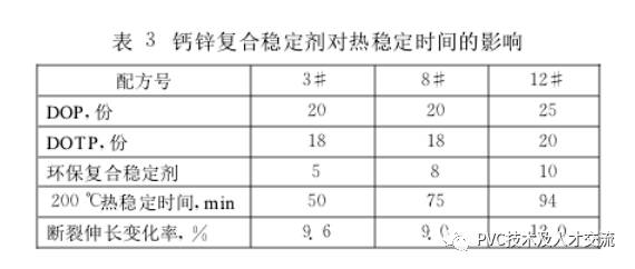 環(huán)保PVC絕緣料的穩(wěn)定劑不能含對(duì)人體有危害的鉛(Pb),鍋CCd}、汞(Hg)、砷(As)、鉻(Cr)、硒(Se)、銻(Sb)等重金屬元素,因此選用無毒的鈣鋅復(fù)合穩(wěn)定劑。鈣鋅復(fù)合穩(wěn)定劑的熱穩(wěn)定性接近或超過某些鋇/鍋穩(wěn)定劑、鉛類穩(wěn)定劑,并且耐候性好、透明性良好。鈣鋅復(fù)合穩(wěn)定劑對(duì)熱穩(wěn)定時(shí)間的影響見表3配方中填充劑25份,潤(rùn)滑劑0.6份,抗氧劑0.6。鈣鋅復(fù)合穩(wěn)定劑的加入量太少材料老化性能不合格,加入量太多成本太高,一般加入5份左右比較合適。