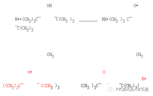 受阻酚類分子中含有O—H的具有活潑氫原子的反應官能團,由于氫原子的轉(zhuǎn)移與由熱,光和氧的作用,生成的大分子游離基R*和過氧游離基ROO*作用,生成較穩(wěn)定的大分子,而本身變成活性低的不能傳播鏈式反應的游離基Ar*,從而使鏈式反應停止。以2,6~二叔丁基~4~甲苯酚(264)為例說明其“捕捉”大分子游離基抑制老化的機理。