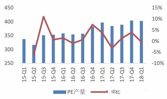 數(shù)據(jù)顯示,中國聚乙烯進(jìn)口依存度在40-45%左右,進(jìn)口依賴度較高。2018年1月份聚乙烯進(jìn)口128.9萬噸,環(huán)比增加17%。2月份由于春節(jié)假期因素進(jìn)口量下降明顯,但3月份從遠(yuǎn)洋貨物的到港情況來看,進(jìn)口量仍存較高預(yù)期。