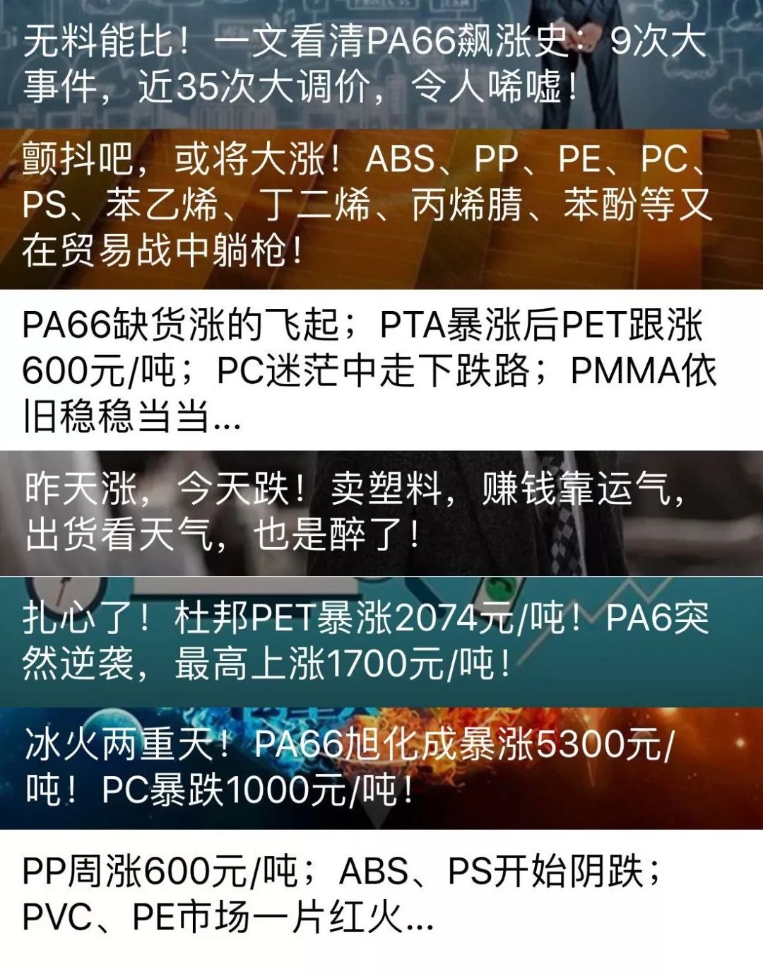 再來看看塑料行業(yè),近期行情也是起伏不定,近兩天才逐漸小幅回調(diào),很多終端企業(yè)飽受漲價(jià)之苦!