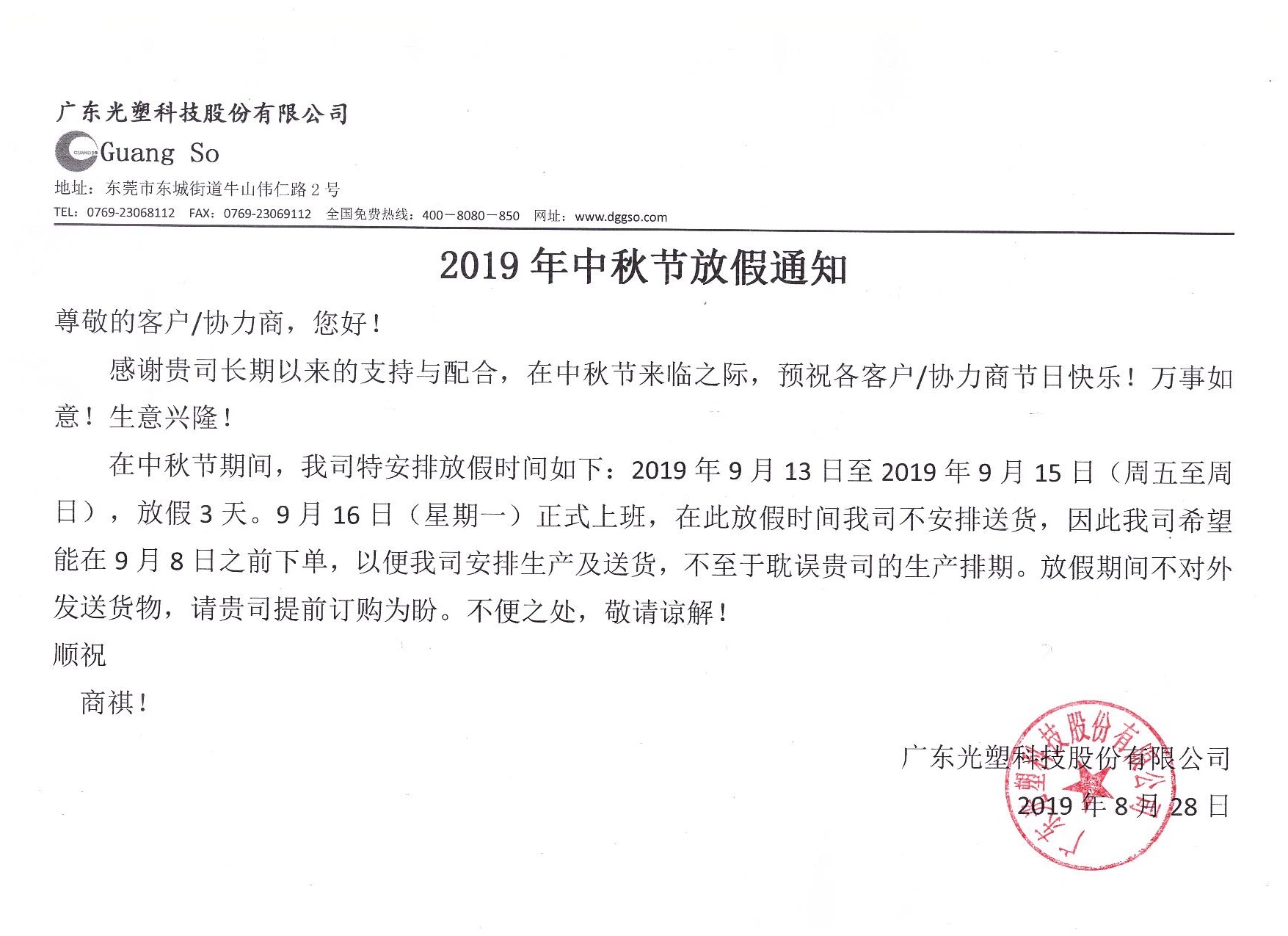 在中秋節(jié)期間,我司特安排放假時(shí)間如下:2019年9月13日至2019年9月15日(周五至周日),放假3天。9月16日(星期一)正式上班,在此放假期間我司不安排送貨,因此我司希望能在9月8日之前下單,以便我司安排生產(chǎn)及送貨,不至于耽誤貴司的生產(chǎn)排期。放假期間不對(duì)外發(fā)送貨物,請(qǐng)貴司提前訂購(gòu)為盼。不便之處,敬請(qǐng)諒解!