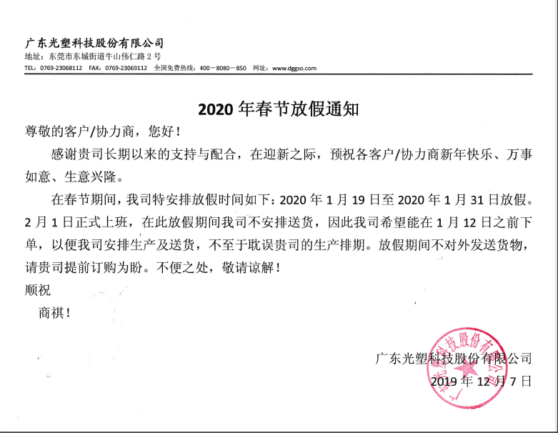 在春節(jié)期間,我司特安排放假時間如下:2020年1月19日至2020年1月31日放假。2月1日正式上班,在此放假時間我司不安排送貨,因此我司希望能在1月12日之前下單,以便我司安排生產(chǎn)及送貨,不至于耽誤貴司的生產(chǎn)排期。放假期間不對外發(fā)送貨物,請貴司提前訂購為盼。不便之處,敬請諒解!