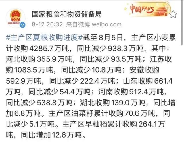 隨著央視抨擊吃播浪費的現(xiàn)象以及聯(lián)合國發(fā)布的饑餓問題后,糧食危機一時間飚上各大新聞版塊。8月12日,國家糧食和物資儲備局發(fā)布今年夏糧的收購情況:截止8月5日,主產(chǎn)區(qū)小麥累計收購4285.97萬噸,同比減少938.3萬噸!驟減的數(shù)量,令國人心中一驚。